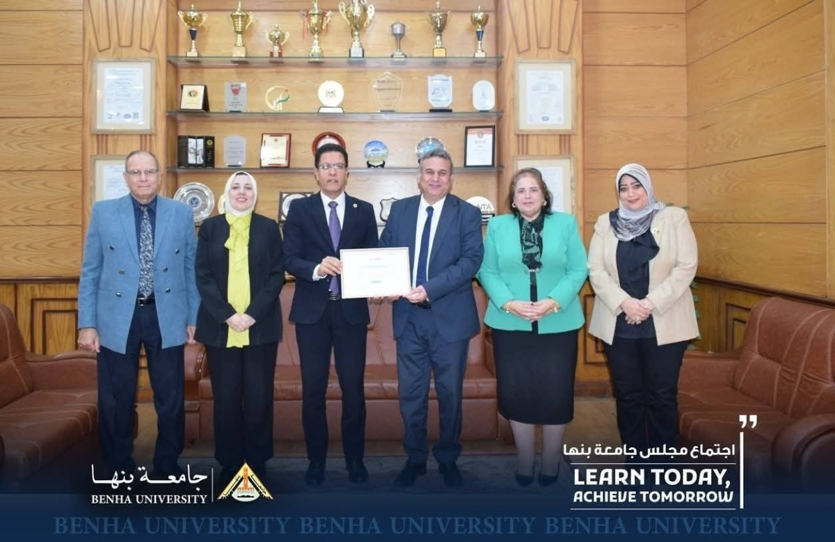 معالى رئيس جامعة بنها يكرم أ.د/ محمود الزعبلاوي عميد كلية الزراعة بمشتهر الفائزة بالمركز الأول في جائزة جامعة بنها للتميز الداخلي الدورة الثانية لعام 2025والمرشحة لتمثيل الجامعة بجائزة مصر للتميز الحكومي في دورة ٢٠٢٦ بحضور الدكتورة جيهان عبد الهادى نائب رئيس الجامعة لشئون الدراسات العليا والبحوث، وأعضاء مجلس الجامعة .